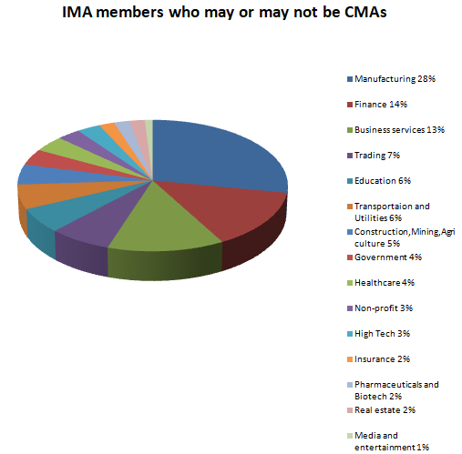 This data shows the %age of IMA members who may or may not be CMAs.There are more than 50% industries of manufacturing, finance and business services where CMAs are employed,because these industries prefer professionals who can analyze the financial statements to improve business efficiency and operation.